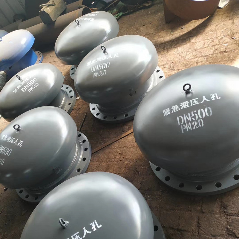 紧急泄压人孔是快速泄压装置,其技术性能、主要零部件材料与呼吸人孔相同。 紧急泄压人孔是安装在石油化工等设备和储罐上的安全应急通风装置,通常与罐顶上安装的呼吸阀配套使用,维持罐内的正常压力,既能避免因意外原因造成罐内急剧超压或真空时,损坏储罐而发生的事故;具有定压排放、定压吸入、式闭灵活、结构紧凑、密封性能好、安全可靠等优点。